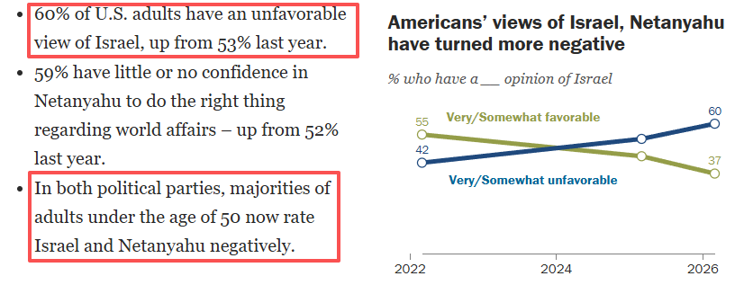 - 民意层面,皮尤研究中心近期的民调结果显示,60%的美国成年人对以色列持负面看法,高于去年的53%。无论党派归属,50岁以下成年人中的大多数受访者对以色列及其总理内塔尼亚胡的评价都是负面的。