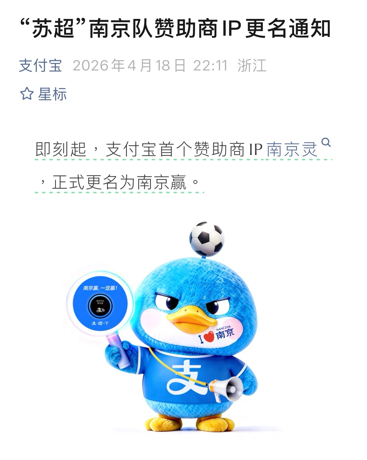 昨天,“苏超”宿迁与南京的比赛因演员何润东到来而备受关注。赛场上,球队比拼跌宕起伏;赛场外,一则趣味改名悄然刷屏——南京队遗憾落败,原本萌趣的城市IP“南京灵”,因谐音“南京零”被网友调侃“负全责”,赛事合作方支付宝顺势将IP更名为“南京赢”。