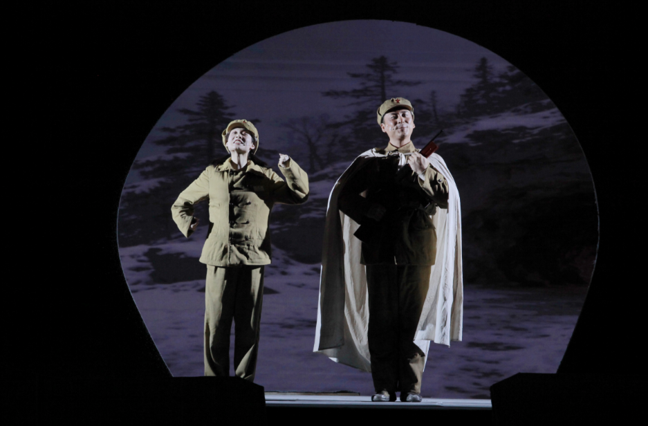 导演李珺采用双线跨时空叙事,利用纱幕和高台将舞台分割为两侧,一侧是战场废墟与文工团山洞,另一侧是姥姥家、爷爷家。钢琴与冲锋号成为时空转场的枢纽,投影与大屏结合,让历史碎片自然渗入现实。贯穿全剧的原创主题曲《你听见了吗》,由孟宁馨作词,成为两代人的情感纽带。剧中还融入了《中国人民志愿军战歌》《鸿雁》《小苹果》等歌曲,战场上的歌声与海岸边的歌唱在剧场空间形成跨时空交响。