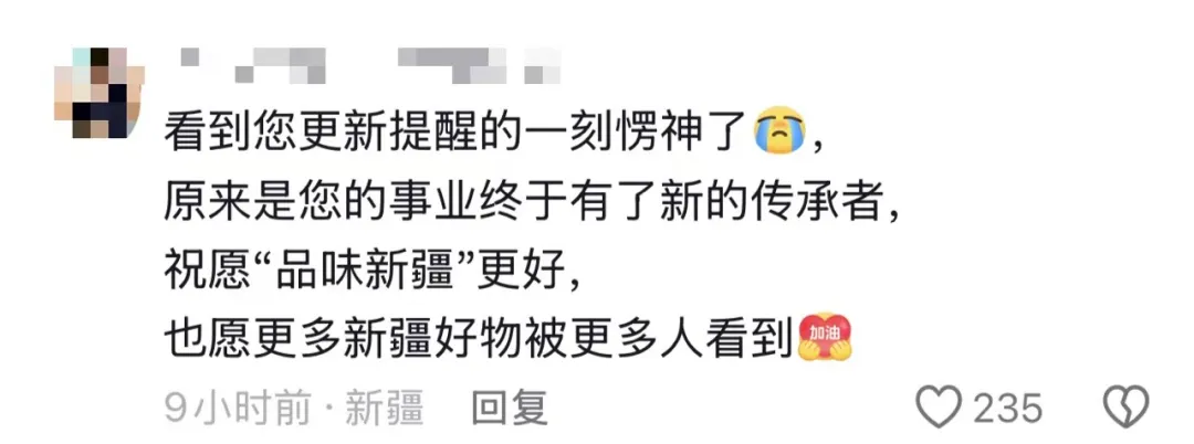 4月19日下午,上述账号还在贺娇龙账号评论区中留言:专注做好“品味新疆”新疆农产品宣传推广和助农事业,请贺主任放心,请一直关注“品味新疆”的大家放心,定不负期待。