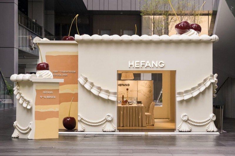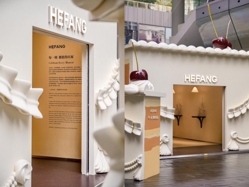 本次HEFANG「灵感蛋糕屋」快闪店以「每一刻,都值得庆祝」为主题,外观以奶油蛋糕为整体造型,墙面覆以细腻的奶油裱花,正门一角被巧妙「切开」形成独立展示面,延续品牌一贯的趣味设计基因。