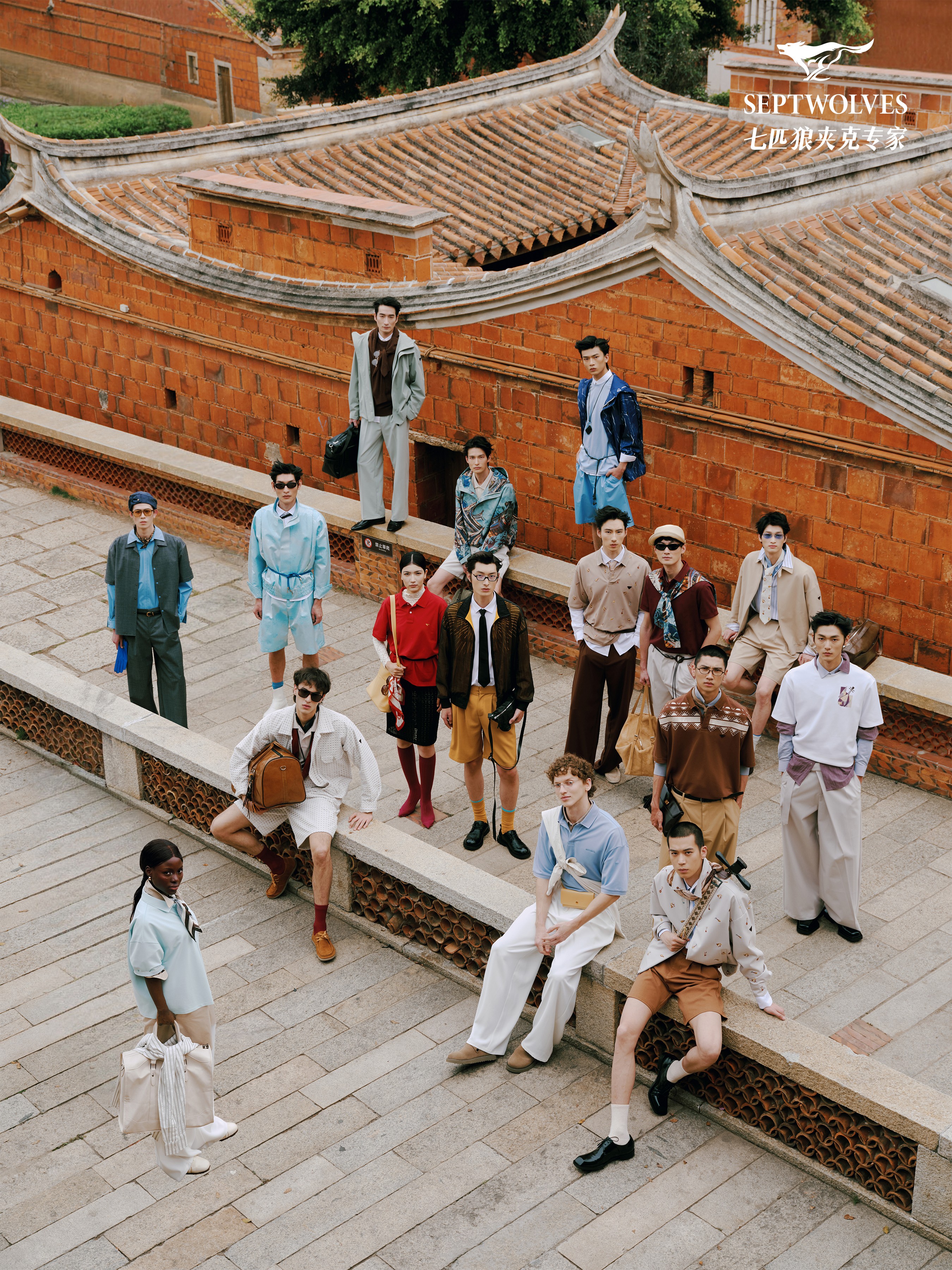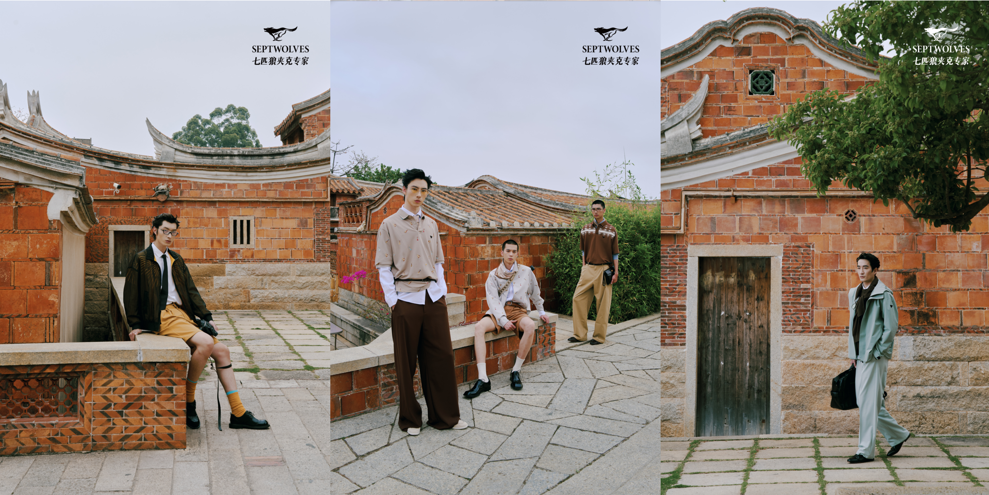 七匹狼从闽南文化的根脉中汲取养分,完成了一次从“文化元素”到“设计语言”的深度转译:闽南传统建筑的燕尾脊,其灵动的飞燕造型被解构抽象为服装廓形线条。清末民初由南洋华侨带回的花砖,如今是泉州的视觉名片,其几何美学被转化为面料肌理与色彩搭配,中西合璧的侨乡记忆在针脚间浮现。寓意“年年有余”的闽南滴水兽,也被提炼为精致的图案元素,甚至南音的韵律也能转化为剪裁的节奏。