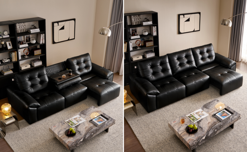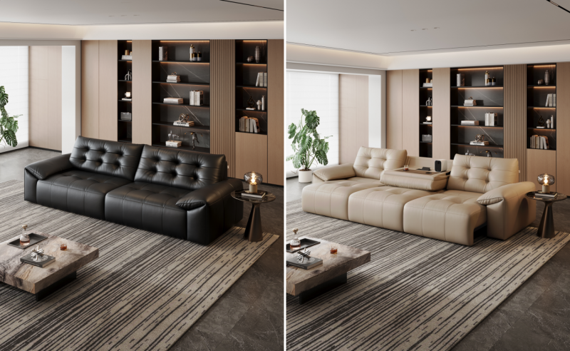 大C位电动沙发,深空黑、浅卡其双色可选,沙发多形态自由切换,日常追剧保持标准沙发形态,舒适落座;午休放松切换贵妃位模式,腿部自然舒展,惬意不设限;大床模式彻底放平,无论是深夜家庭影院,还是偶尔留宿亲友,都能舒适躺平。全天候动线适配,轻松满足现代家庭的多元需求。