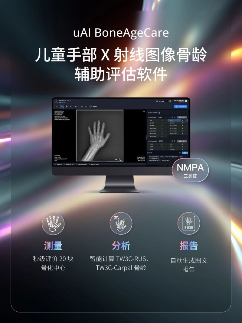 我国2.71亿0至17周岁青少年儿童中,48%-63%儿童存在生长发育异常,但99.5%的发育迟缓患者未得到及时规范诊疗。传统人工骨龄检测评估采用图谱法或计分法,要么一致性差,要么耗时耗力。该软件基于现代中国儿童的骨龄图谱提供骨化中心的自动检测,支持TW3C-RUS、TW3C-Carpal等多种评估标准,可同时给出3种方法的身高预测结果。基于uAI算法,多骨龄评估方法阅片平均误差低至4个月,可比肩国际专家,既缩短了医生评估时间,又提升了结果准确性,为儿童生长发育评估提供有力支持。