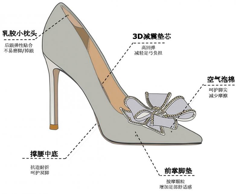 在此基础之上,lilywei通过结构化的“舒适黑科技”,将质量从“合脚”提升至“裸感”的体验层面。从鞋头内里如气垫般温柔包裹脚尖的空气泡棉,到前掌脚垫上缓解压力的按摩颗粒;从为足弓提供持久稳定支撑的撑腰中底,到能高效吸收冲击力的3D减震垫芯,乃至后跟处弹性贴合脚跟的乳胶“小枕头”……这些工艺共同构成了一套环环相扣的缓震支撑系统。它们协同工作,化解高跟鞋行走时足部的集中受力点,将质量转化为每一步的实际轻盈感。