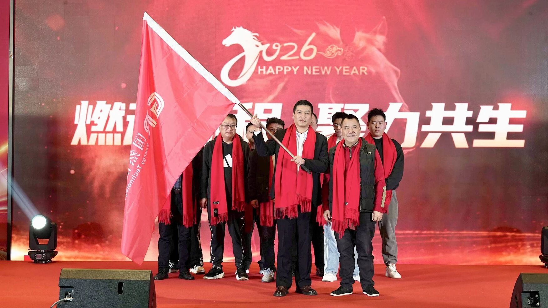 年会高潮环节,国然铁军授旗仪式隆重举行。方荣跃董事长亲手将国然大旗交予总经理黄忠海,郑重嘱托“旗帜所指,使命必达”。黄忠海手持大旗,带领团队庄严宣誓,誓言铿锵有力,彰显出国然人奋勇争先、使命必达的铁军精神,也标志着国然2026年全国市场攻坚正式启动。