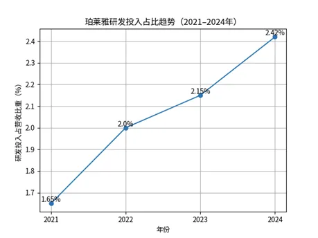 当前,中国美妆市场正经历从“速度驱动”向“质量驱动”的深刻转型,行业增速逐步趋缓,存量竞争愈发激烈,科技研发能力已取代渠道营销,成为决定企业长期竞争力的核心变量。在此行业背景下,国货美妆龙头企业珀莱雅股份持续加码研发投入,其研发费用占比从2021年的1.65%稳步攀升,已达到明显高于行业均值的约2.5%,清晰彰显出企业以技术沉淀积累核心优势、换取长期发展空间的战略定力。