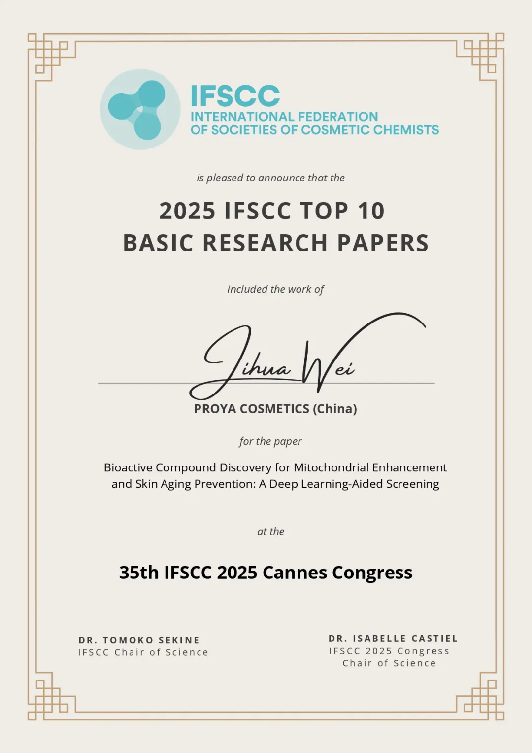 (珀莱雅股份荣获“2025IFSCC十大基础研究奖”)