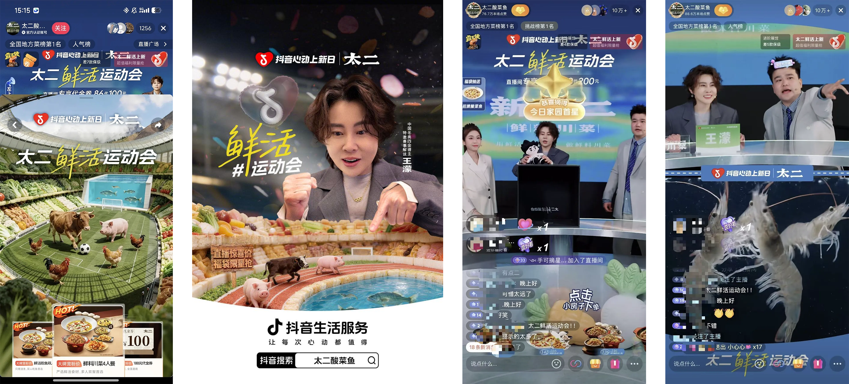 本次上新营销的核心亮点,是与平台联手打造直播内容IP“鲜活运动会”:以体育赛事形式重新解构食材“竞技”,将抽象的鲜活概念转化为可感知的沉浸式体验。太二请来奥运冠军王濛助阵,从调侃小猪“胸肌线条真好看”到点评活鱼“转身速度得练”,轻松氛围中食材鲜活品质被直观呈现。整场直播最高实时在线超18万,登顶全国地方菜榜第一名。