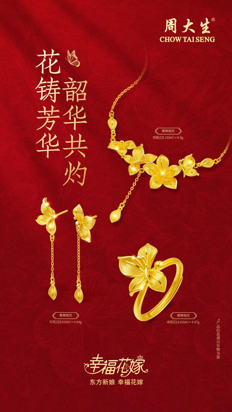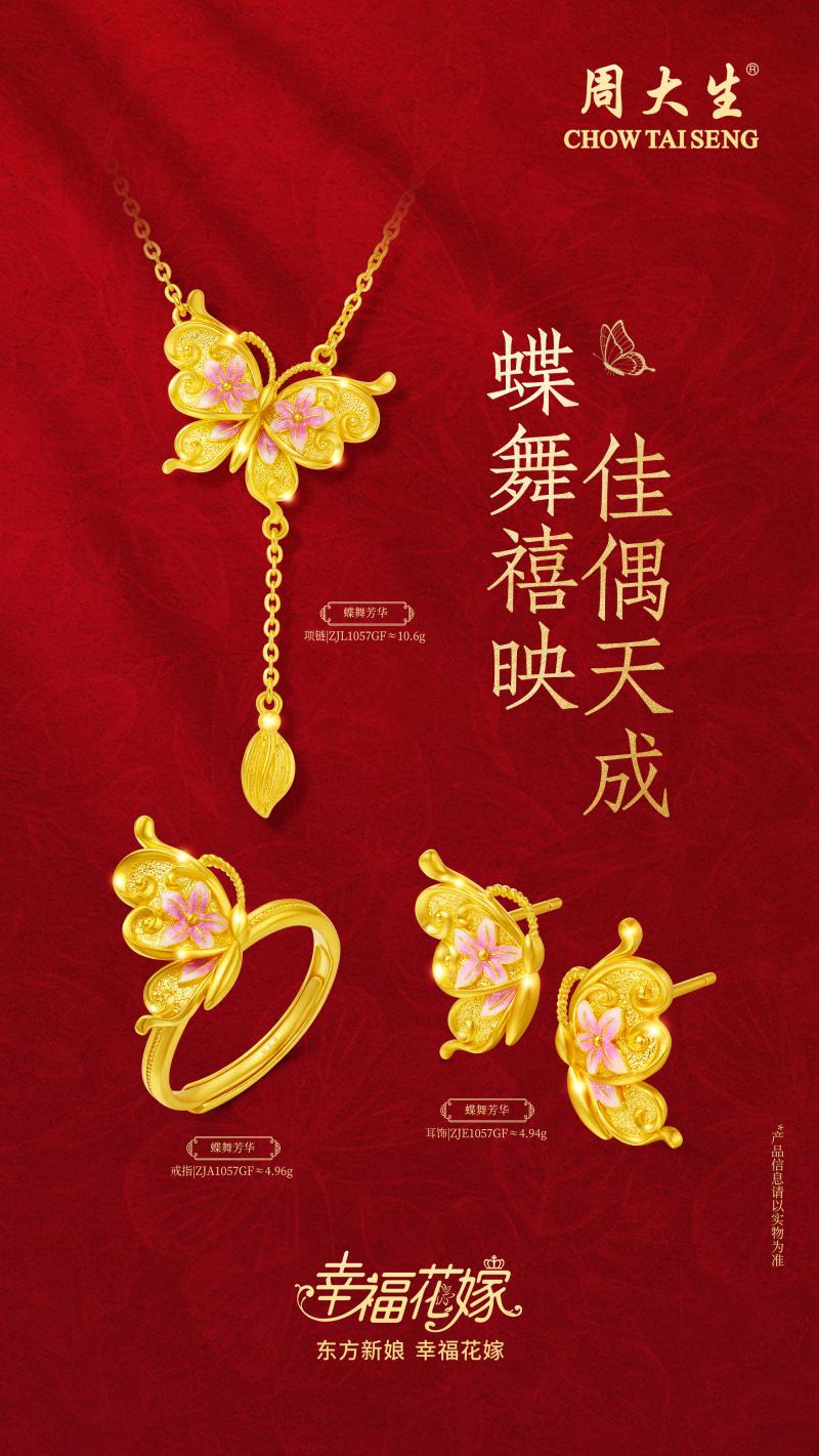 红妆十里,凤冠为聘;蝶舞花间,良缘永缔。中式婚嫁的浪漫,从来不止于仪式,更藏于千年传承的文化底蕴与匠心工艺之中。周大生幸福花嫁系列作为中国婚嫁文创珠宝标杆,深挖东方婚嫁文化内核,以非遗花丝工艺为桥梁,融合现代黄金美学,持续为当代新人打造有文化、有温度、有美感的婚嫁珠宝,诠释“东方新娘,幸福花嫁”的美好愿景。