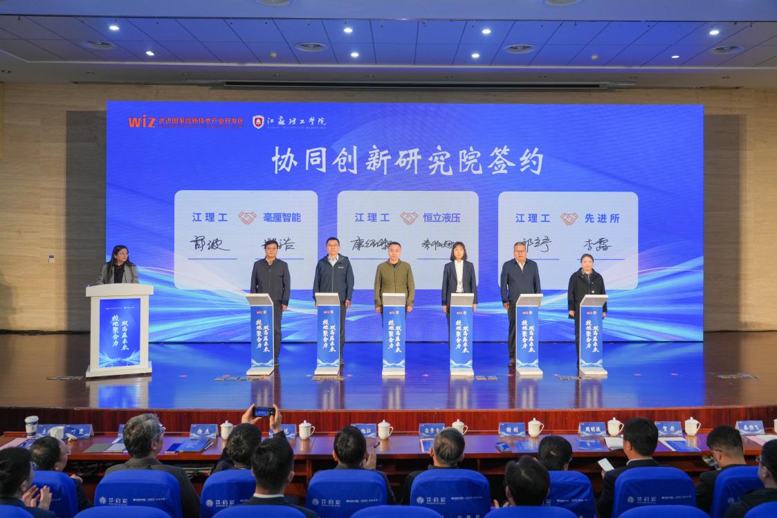 会议现场,校地双方率先完成产业链党建共建签约,以党建链串联创新链、人才链、产业链,构建“党建引领、产业协同”新格局。江苏理工学院与龙头企业签约共建具身智能流体装备协同创新研究院、智能控制与制造系统协同创新研究院、空间智芯与智航协同创新研究院。三大研究院将汇聚教授团队和头部企业资源,聚焦核心技术研发与成果转化,打造协同创新平台,推动科技成果加速从“实验室”走向“生产线”。
