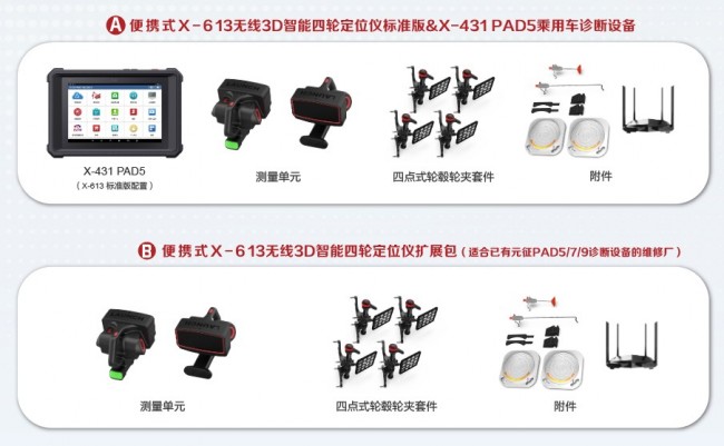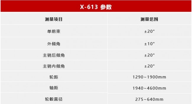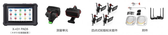 X-613标准版配置包含X-431 PAD5汽车诊断设备,设备间通过无线传输数据可实时显示测量数据,车底调校更方便。