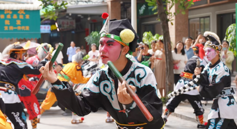 本次嘉年华的核心亮点,在于一场极具视觉冲击力的英歌舞表演。英歌舞被誉为“中华战舞”,其刚劲有力的步伐与槌花翻飞的阵势,象征着潮汕人骨子里的热血与坚韧。当这种充满力量感的非遗艺术走上揭阳玉器街,与温润内敛的翡翠玉石形成强烈的感官反差,不仅为传统的产业街区注入了蓬勃的活力,更以一种“国潮”的方式,让非遗文化从“博物馆陈列”走向了鲜活的市井生活。