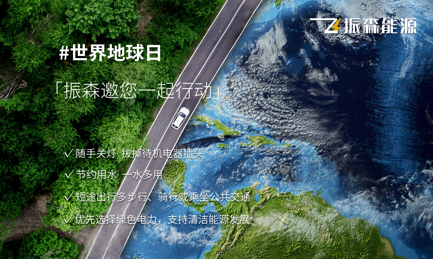#世界地球日,振森能源邀请您一起行动:随手关灯,拔掉待机电器插头;节约用水,一水多用;短途出行多步行、骑车或乘坐公共交通;优先选择绿色电力,支持清洁能源发展!