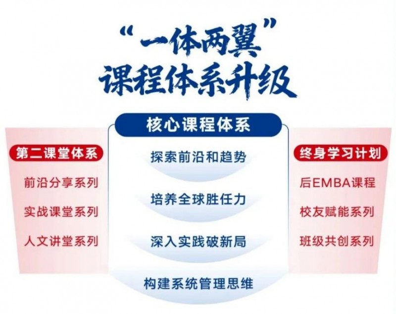 “两翼”之一是第二课堂体系,包括前沿分享、实战课堂、人文讲堂;另一翼则是终身学习计划,包括后EMBA课程、校友赋能系列、班级共创等。