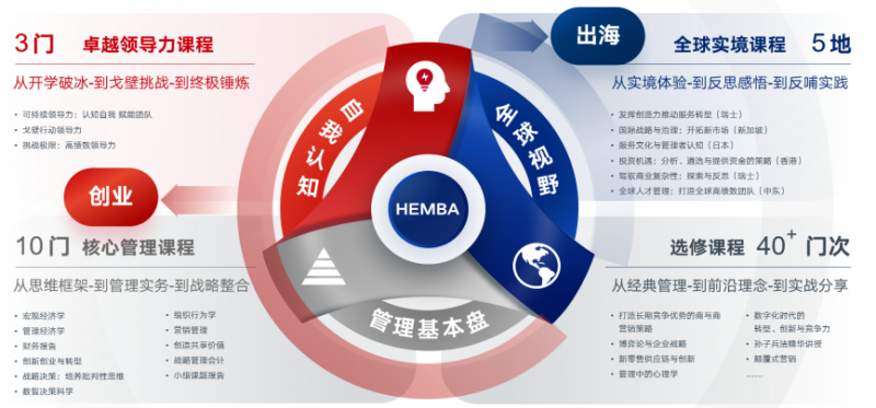 2.中欧HEMBA在夯实管理基本盘的“EMBA核心课程”之上,融入以全球化为特色的“5大全球实境课程”,并设计了一系列卓越领导力课程贯穿学习始终。