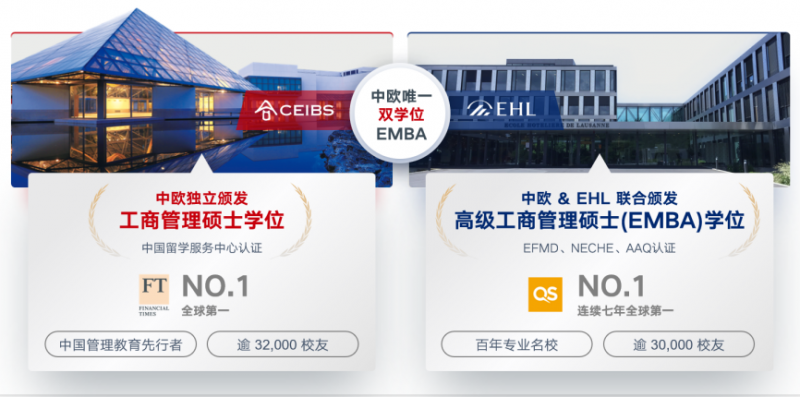 2.中欧HEMBA课程背靠两所全球顶尖商学院,对成绩合格的毕业生授予双学位,学位获多重国际国内认证。