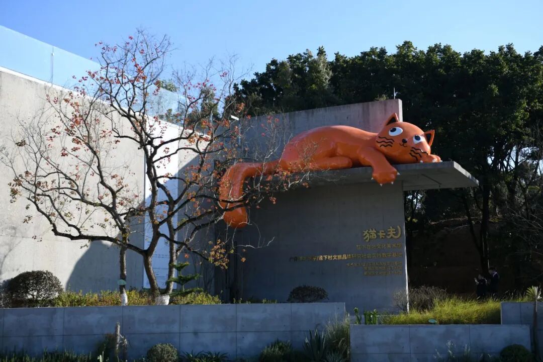 在广州市黄埔区迳下村,坐落着一座充满艺术感的建筑——该区图书馆猫卡夫艺术分馆,外墙上趴着的橙色大猫彩塑格外引人注目。 许建梅 摄