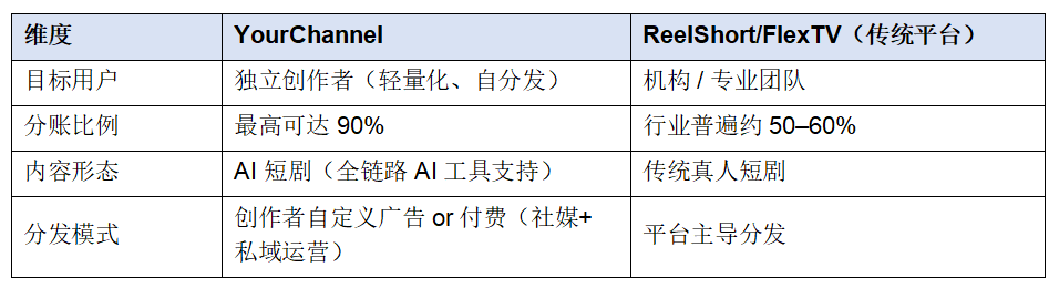 根据公开资料显示及公司相关人员称,YourChannel 将自身定义为面向新一代创作者的一人内容变现平台,核心模式是“付费观看 + 超高比例分成 + 创作者自主分发”。平台方面称,创作者最高可获得 90%的分账比例,并可通过社交媒体、社群和私域渠道进行自主分发,使内容收益更直接、更快速地回到创作者本人。