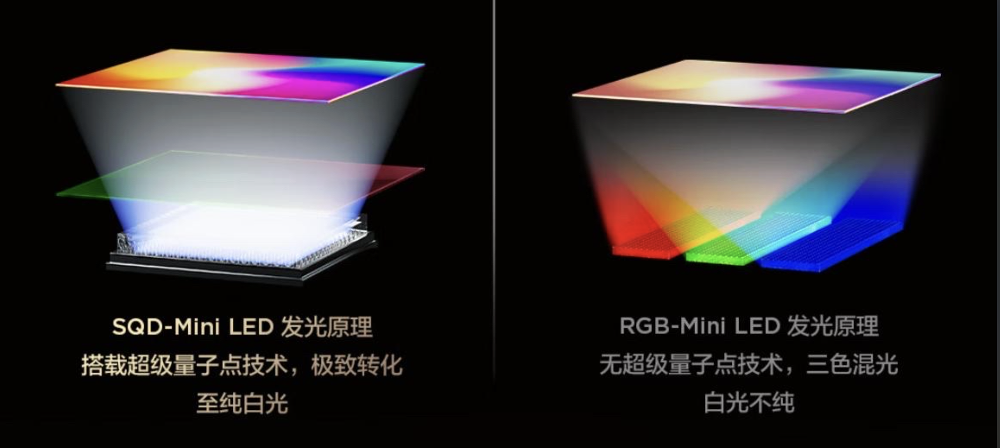 当然,对于Mini LED电视而言,护眼只是观影体验的基础,画质才是选购的首要因素。电视画质的核心,取决于对比度、色域、峰值亮度三大核心指标,那么在这三大维度上,SQD-Mini LED与RGB-Mini LED上在底层技术层面存在哪些差异呢?