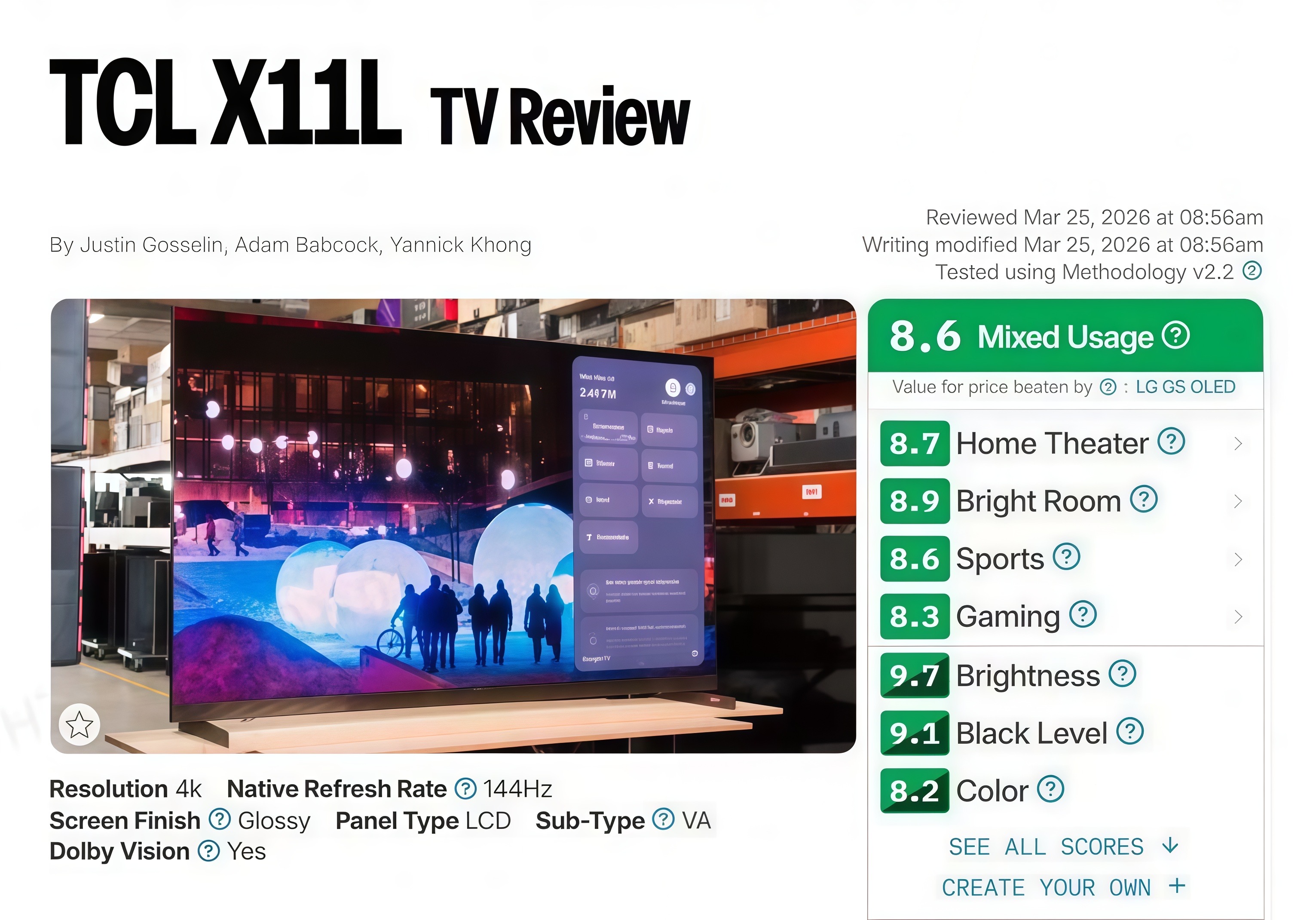 值得一提的是,SQD技术自去年推出以来,搭载该技术的X11L机皇电视就先后斩获了CES创新显示技术金奖、AWE2026艾普兰金奖等多项国际权威大奖;在近期权威的Rtings测评中,X11L更是以8.6分登顶LCD品类历史最高分,不仅实现断崖式领先,得分甚至超越了OLED品类的平均分,技术含金量毋庸置疑。