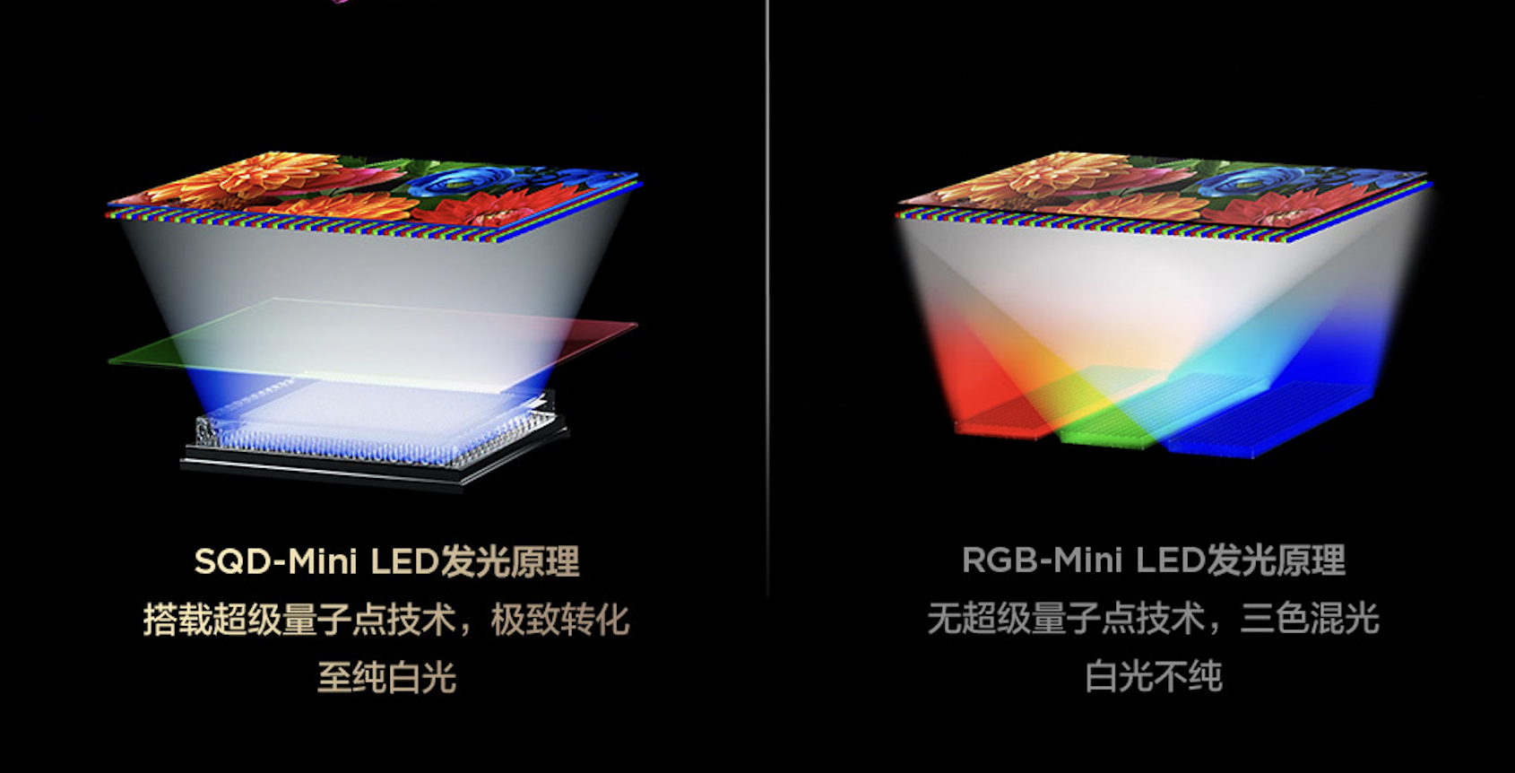 尤其是当下已成客厅标配的Mini LED电视,技术路线早已彻底分化,其中SQD和RGB作为两大主流阵营,更是让不少人在选择时犯了难。今天咱们直接从“护眼”和“画质”这两个大家最关心的核心维度,把这两条技术路线的差异讲得明白,看完这篇再也不用为选电视发愁。