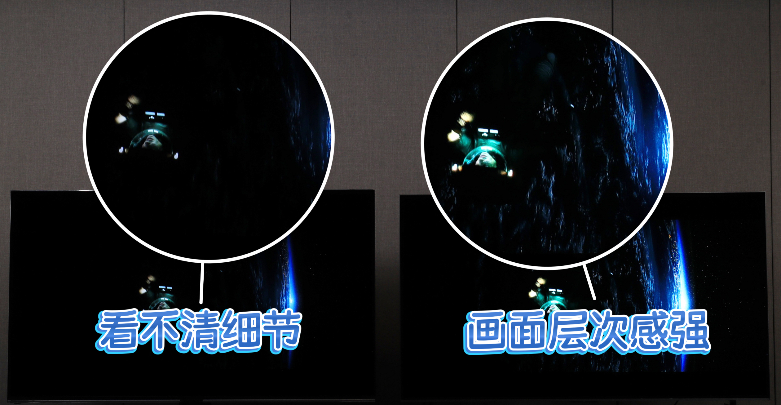 先看对比度和控光,这是决定画面层次感的关键。RGB采用“三灯一分区”设计,也就是说,需要红、绿、蓝三颗灯珠才能组成一个有效背光分区,控光全依赖分区驱动芯片,不仅响应速度慢,还容易出现“边缘漏光”的问题。而SQD则采用“单灯一分区”设计,单颗灯珠就能完成白光发射和色彩转化,一个万象分区控光效果远大于RGB三个分区效果,同规格下控光效率优势十分明显。再加上“万象分区”控光技术,通过全链路底层优化实现“一区顶多区”的极致控光——看暗场场景,能清晰呈现人物的轮廓细节,暗部深邃不发灰。