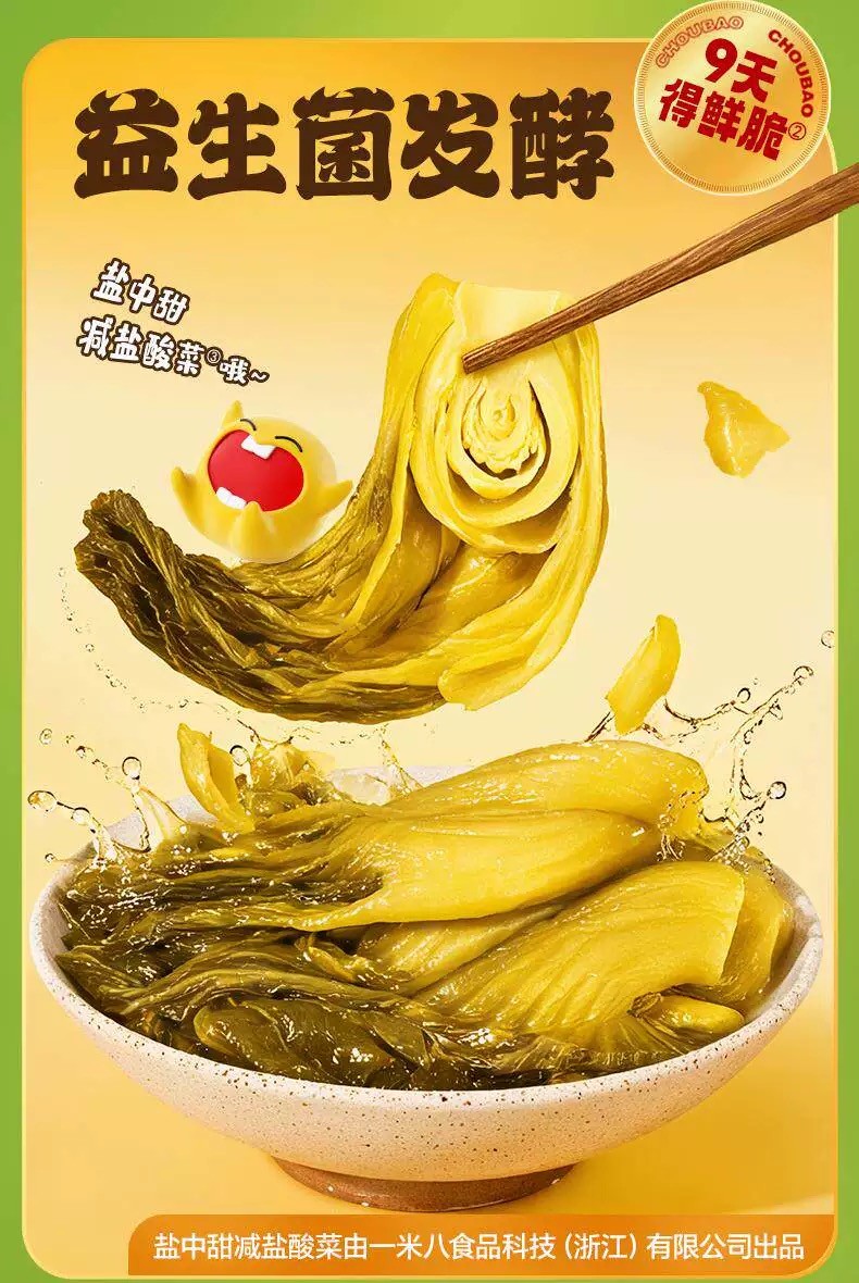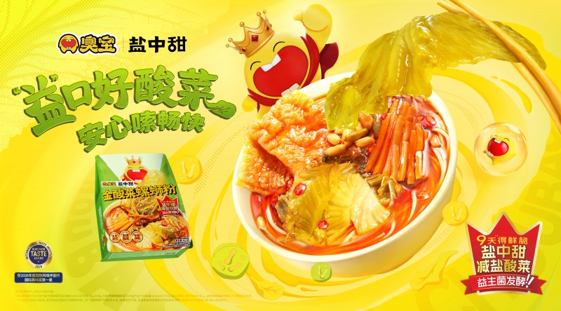 近期,螺蛳粉头部品牌臭宝与阿里农业板块一米八旗下品牌“盐中甜”联合推出金酸菜柳州螺蛳粉。鲜浓螺蛳汤底搭配清爽的益生菌发酵酸菜,为消费者带来全新的嗦粉体验。金酸菜柳州螺蛳粉的核心亮点在于盐中甜益生菌发酵酸菜,采用益生菌直投发酵技术,9天短时精准发酵,更大程度上保留了蔬菜本身的营养以及脆爽口感。区别于传统高盐腌渍的方式,益生菌酸菜发酵过程更健康可控,不用担心亚硝酸盐、添加剂等问题,也打消了很多消费者想吃酸菜又望而却步的顾虑。值得一提的是,臭宝和盐中甜选用云南小叶芥菜制作酸菜,保留大块形状,短时发酵后酸菜根茎呈金黄色——这也是“金酸菜”名称的由来。此外,为了让酸菜和螺蛳粉的风味相得益彰,臭宝品牌为金酸菜螺蛳粉研发“专研伴酱”作为风味联结剂,使酸菜的发酵酸香与螺蛳汤底的鲜辣螺香形成层次递进,实现“酸中带鲜”的味觉结构。