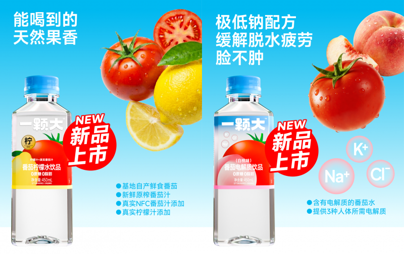 “经过调研,柠檬香及白桃味最受消费者喜爱,接受度及回购率高。此外,此次推出电解质产品,是我们将番茄汁天然0钠的优势带入功能饮品中的一次尝试,希望可以给消费者更多科学补充电解质的水饮选择。”一颗大™产品研发人员提到。