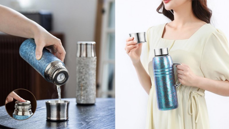 其中,专为茶饮爱好者打造的至臻闷茶杯系列,凭借内外纯钛设计+纯钛茶漏实现茶水分离,熟茶久闷、花茶冷萃皆可胜任。产品还配备机械温显和磁吸设计,兼顾实用与质感,成为商务差旅与居家休闲场景下的讨论焦点;而设计更为现代利落的磁吸悬浮闷茶瓶系列,则通过一体式提环与时尚外观,将钛材质的坚韧轻盈与便携属性发挥到极致,无论是户外露营还是办公间隙,皆能从容应对。