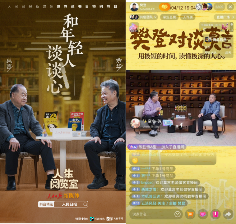 读书日期间,莫言、余华、蔡皋等30多位知名纷纷亮相“春天开阅季”抖音直播间,带来多场读书直播。