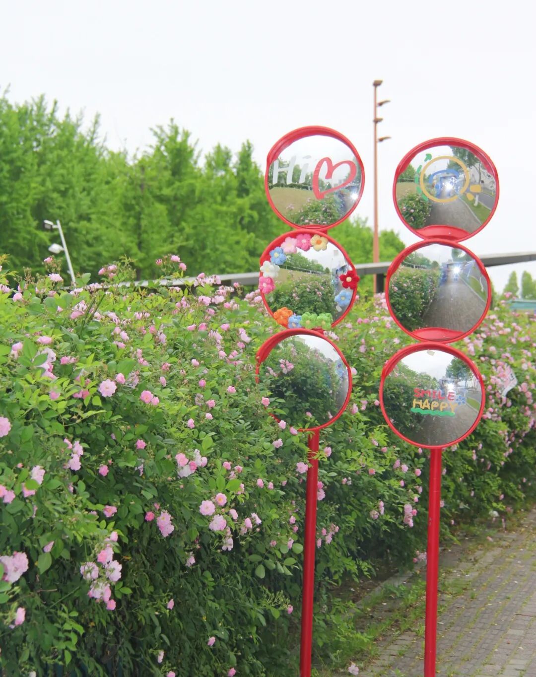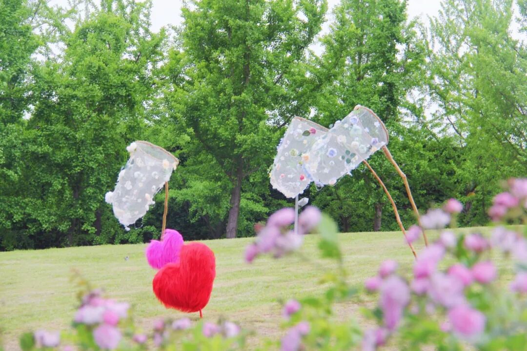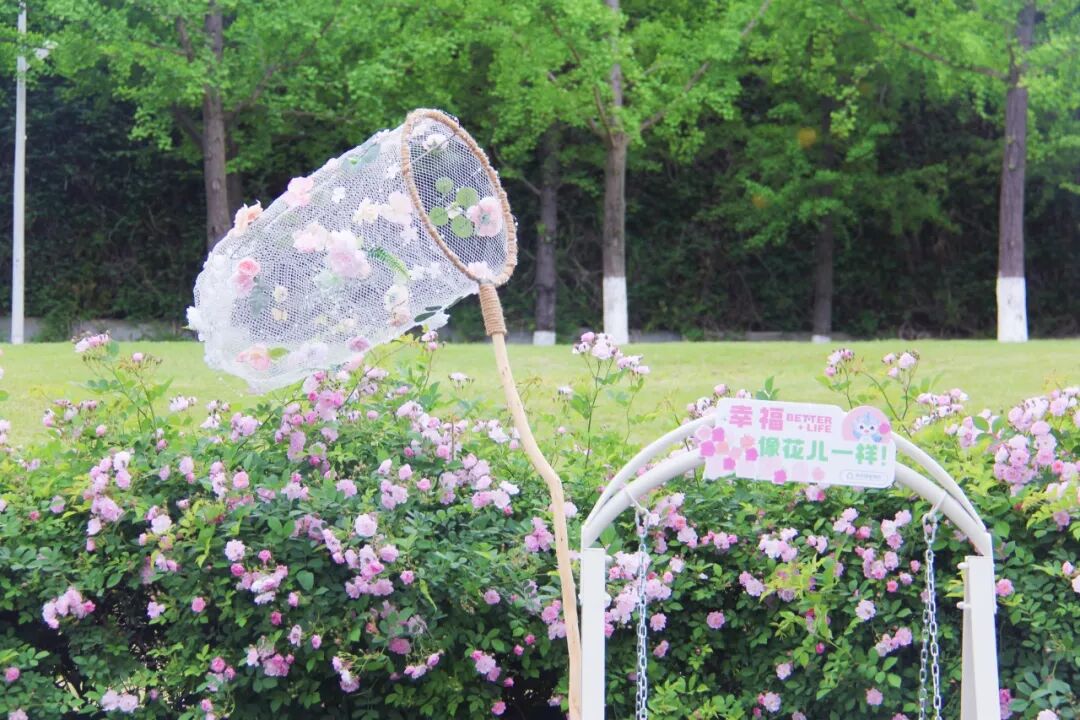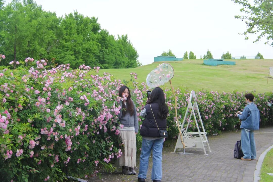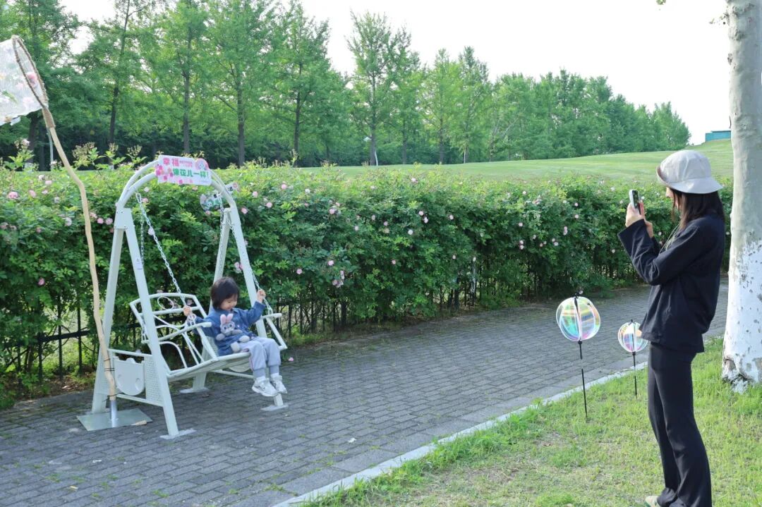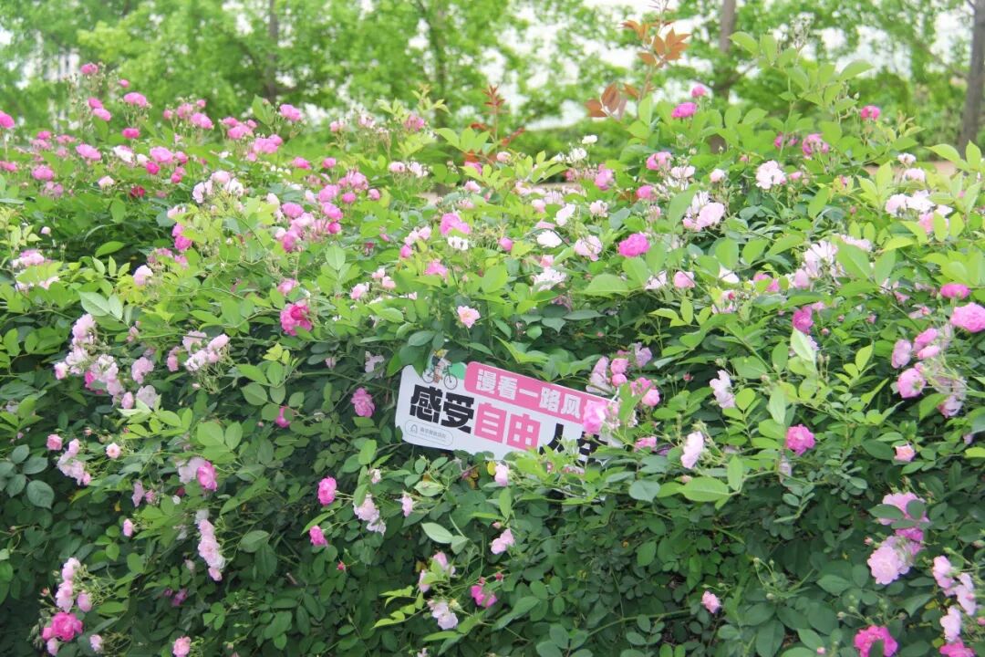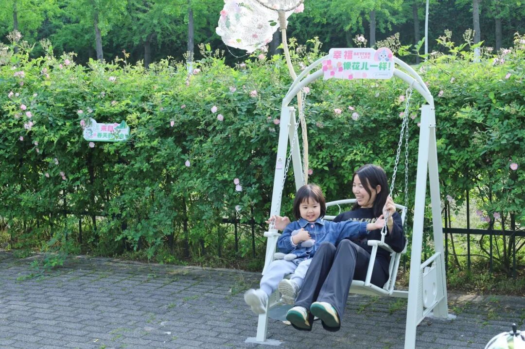 今年,公园在蔷薇花墙沿线新增了多处打卡装置:花间捕梦网、秋千、载满鲜花的复古自行车、各式打卡框、多处创意标语牌……无需自带道具,随手一拍就是氛围感春日大片。