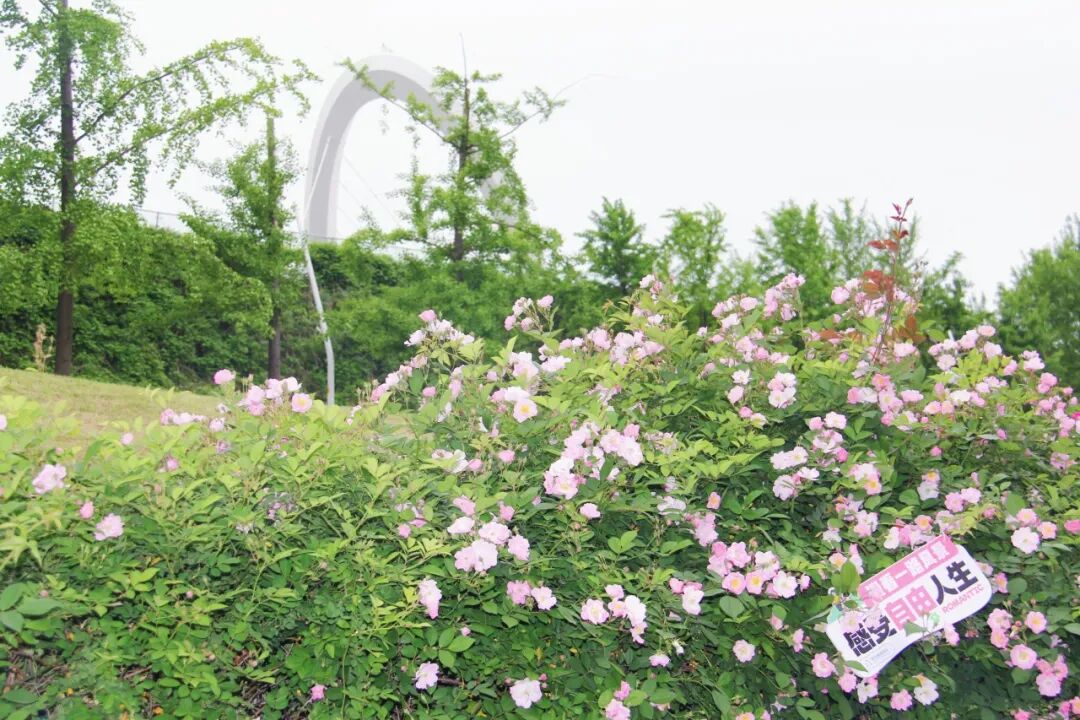 远远望去,蔷薇藤蔓攀援舒展,花枝如瀑倾泻,与青奥双子塔、旗阵广场相映成画,把硬朗的现代建筑线条都糅进了柔软春色里。