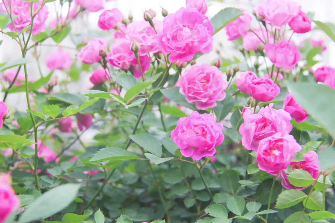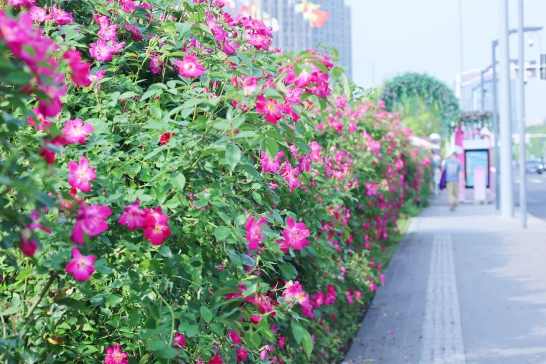 蔷薇是蔷薇科蔷薇属攀援灌木,花朵成簇开放,香气清雅。车站边的蔷薇花海由单瓣品种和重瓣品种组成,其中“七姐妹”为重瓣品种,花量巨大,花开如瀑。而单瓣品种则是“粉团蔷薇”,花瓣轻盈舒展、花色淡雅。