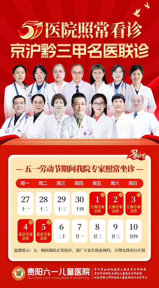 此外,5月1日-5日,特邀三甲儿科教授团,领衔贵阳六一儿科专家,开展MDT多学科专家联合会诊,打出最佳诊疗“组合拳”,帮助儿童解决多动症、抽动症、身高不足、矮小、智力落后、学习困难、注意力不集中、语言发育迟缓、孤独症、厌学、青少年心理等问题。