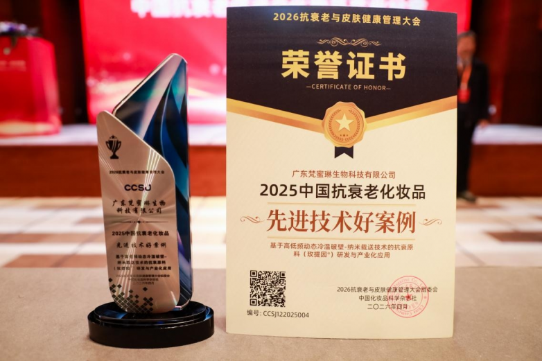 在近日圆满落幕的2026抗衰老与皮肤健康管理大会暨2026中国抗衰老促进会化妆品产业分会年会上,梵蜜琳自主研发的核心抗衰专利成分玫提因®(Rose Gen-X®)凭借突破性技术成果大放异彩,同时斩获“2025中国抗衰老化妆品先进技术好案例”及《中国化妆品科学》“2025年度人气论文”两项重量级荣誉,实现了从基础研究到产业化应用的全链路突破。
