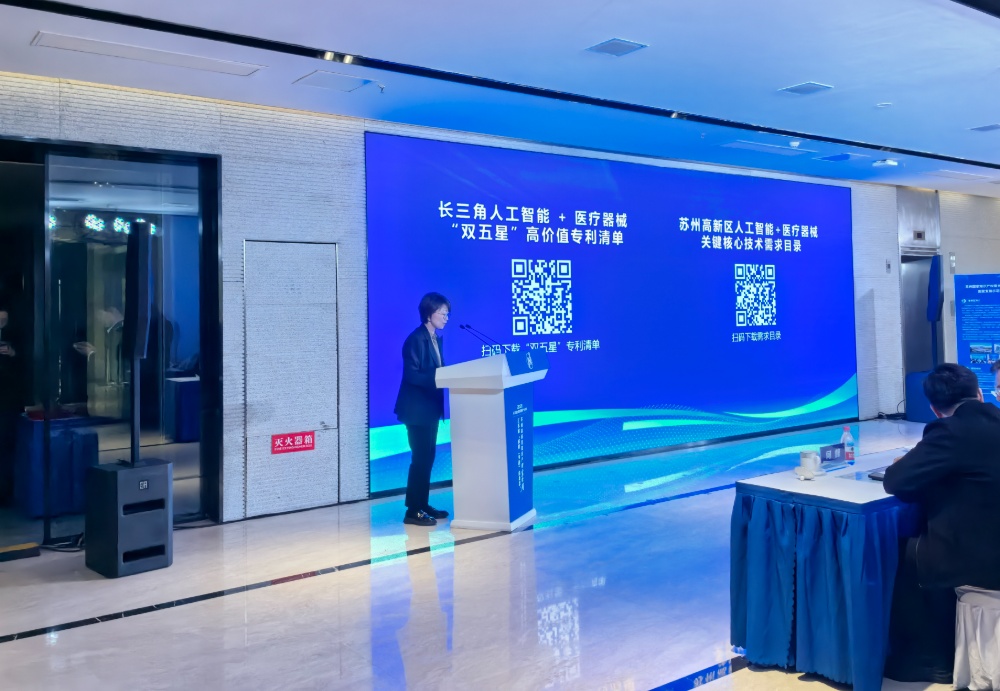 屏幕上出现两个二维码,一个链接高价值专利清单,另一个链接技术需求目录。“诚挚欢迎所有在场的企业、专家与创新团队,扫描屏幕上的二维码,我们的服务团队将在会后为您提供全力服务。”苏州高新知识产权服务有限公司总经理陶琴琴,发布了长三角人工智能+医疗器械“双五星”专利及苏州高新区相关领域的关键核心技术需求。