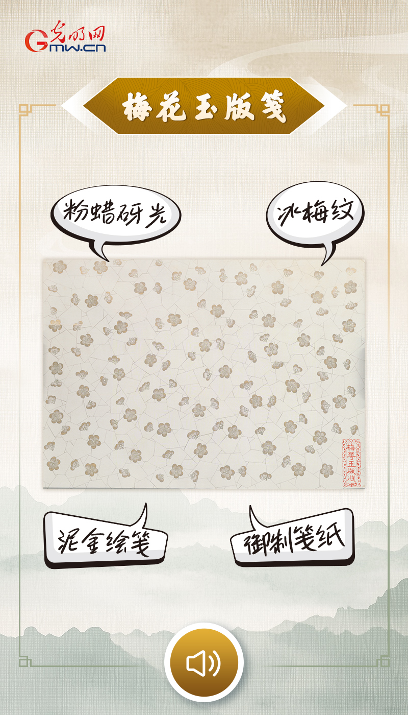 “我是一方梅花玉版笺,以匀滑的皮纸为原料,经施粉、加蜡、砑光多重工序,质地莹润细腻,触手如凝脂般光滑。匠人用泥金细细勾勒冰裂纹路,再以金粉点染朵朵梅花,将冬日冰梅的清雅定格在纸面;右下角勾云纹栏内,‘梅花玉版笺’的朱文隶书印记,是我专属的身份落款。作为宫廷专用的精美纸笺,我带着冬日梅花的清韵,静静铺展于案前,承接笔锋、晕开墨香,见证着每一段与文字相伴的安然时光。”