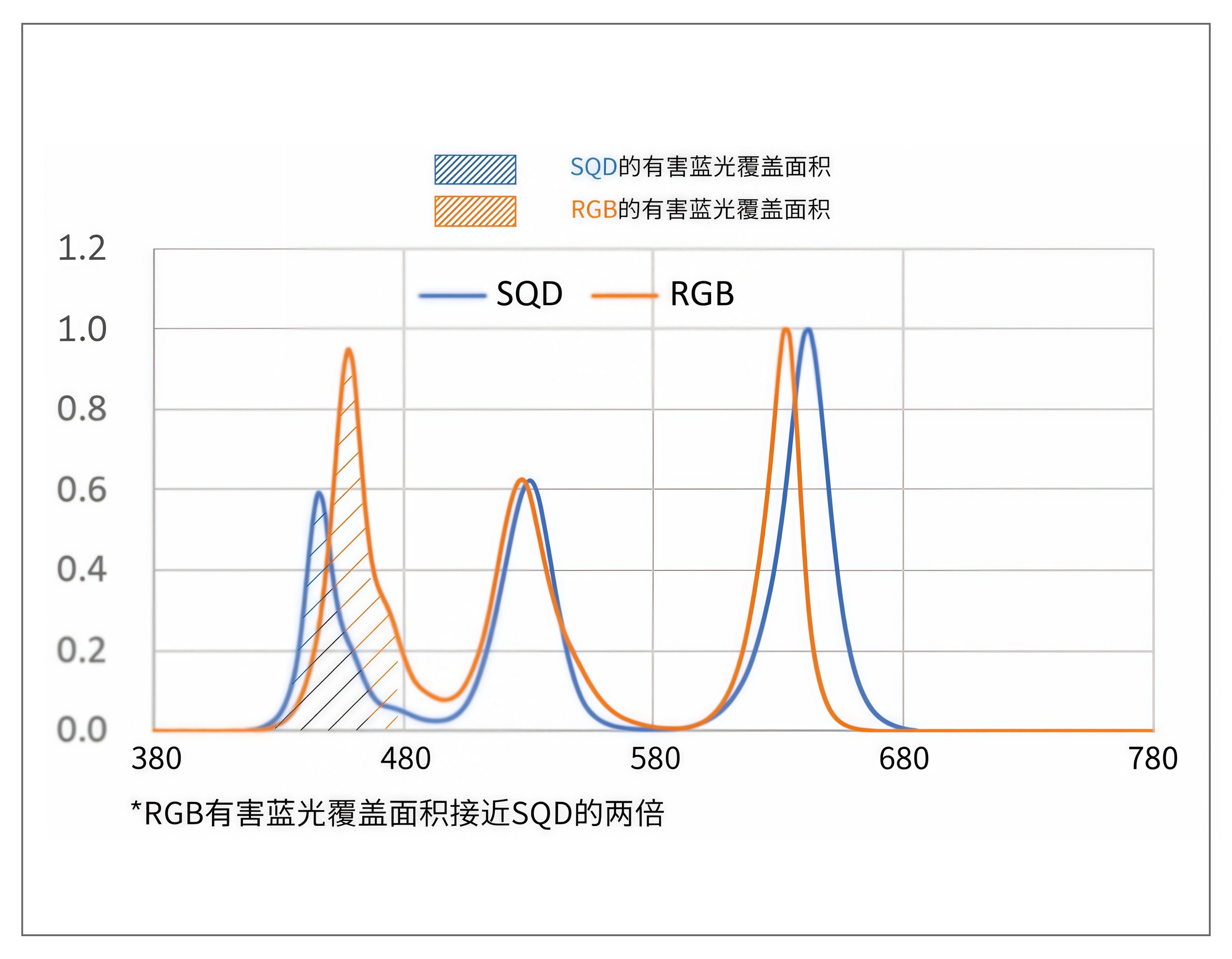 而SQD直接从源头下手,把有害蓝光总能量狠狠压下去,实测SQD有害蓝光能量是RGB方案的一半,这不妥妥的源头级硬核护眼!再加上自家发光芯片效率高,画质不打折所以护眼也不需要妥协,这才是成年人不做选择的满分方案~