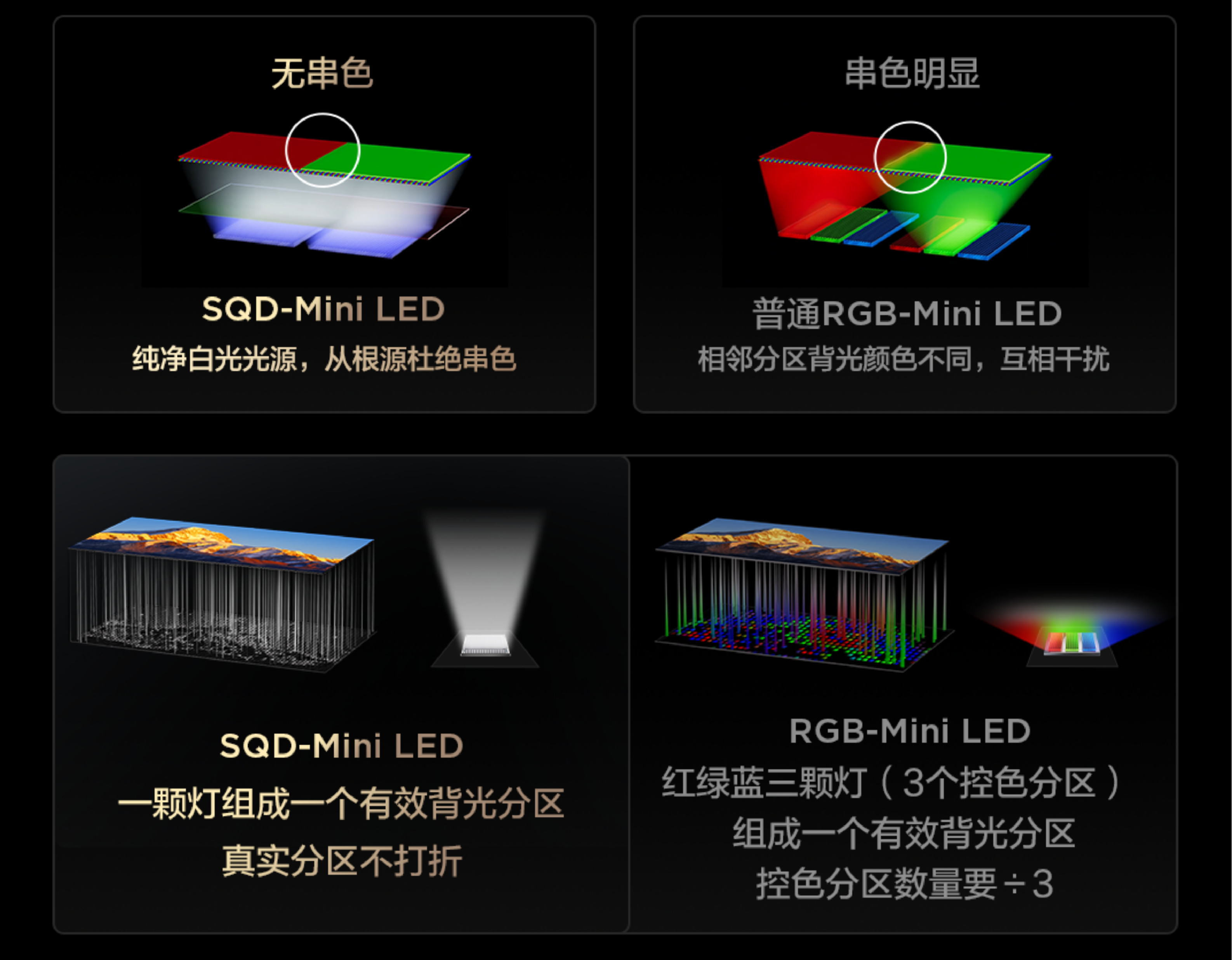 SQD-Mini LED则是单人专精模式,以蓝光激发超级量子点高效“转化”出纯净色彩,从根源杜绝光线互扰串色。一人独立负责一个控光单元,同等成本下能实现数倍于RGB 的分区密度,控光利落不拖沓,明暗层次干净通透,因SQD发光芯片效率高使其自带护眼优势,为后续画质与护眼对决埋下碾压级伏笔。