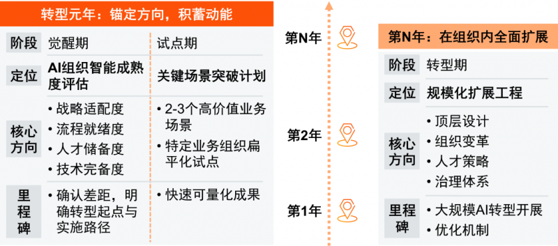 第三阶段实施“规模化扩展工程”,基于已验证的模式构建企业级智能平台,优化组织架构与治理体系,开展大规模AI转型项目,并建立持续优化机制,最终实现从传统组织向智能体组织的平稳演进。