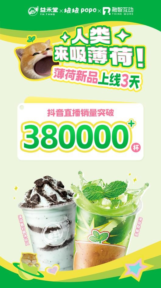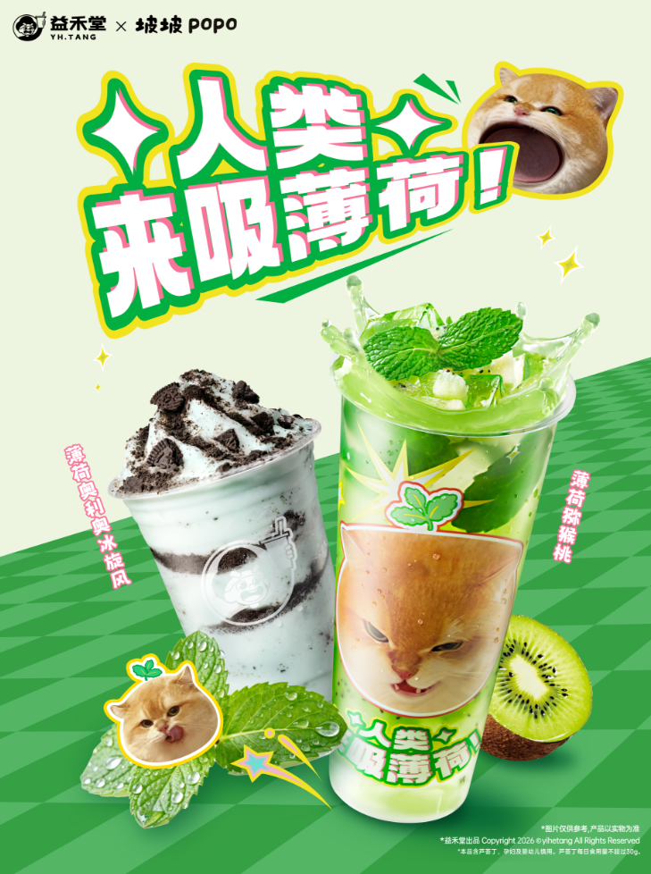 2026年,益禾堂“薄荷家族”迎来四周年。品牌以“人类,来吸薄荷”为主题,携手表情包顶流“坡坡popo”,上新薄荷猕猴桃与薄荷奥利奥冰旋风两款新品,并首次将薄荷风味延伸至甜品线(薄荷大福、薄荷味可可饼干大福)。活动周期内(4月2日-22日),两款联名音饮品总销量图片267万杯,抖音渠道上线3天销量达38万杯,联名套餐销量前三城市为南宁、石家庄、保定。薄荷家族用四年时间,从一款季节性风味成长为益禾堂春季最具辨识度的用户心智符号。