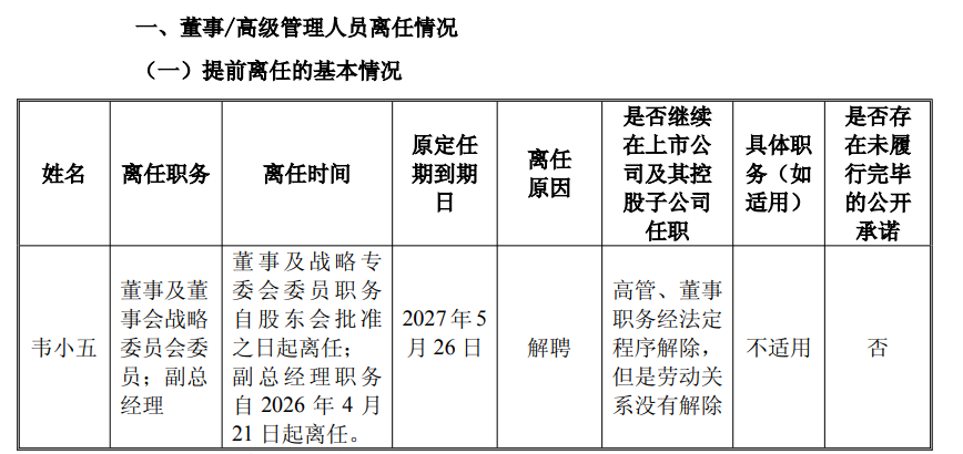 解聘副总经理职务的决议自2026年4月21日起生效,免去董事职务的事项需提交公司股东会审议。公告同时披露,韦小五现年44岁,在同庆楼工作超过11年,2025年其从公司取得的税前薪酬情况已在年报中披露。