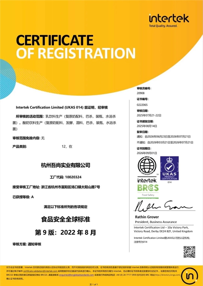 食品安全是全球食品行业的共同语言。吾尚凭借卓越的品控体系,成功通过BRCGS食品安全全球标准认证,这不仅是对其生产管理体系的权威背书,更是一张通往国际市场的“品质护照”。BRCGS标准以严苛著称,被誉为全球食品工业的“金标准”,吾尚能够获此认证,意味着其生产流程、质量管理、安全追溯等各环节均已达到国际先进水平。