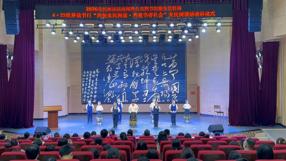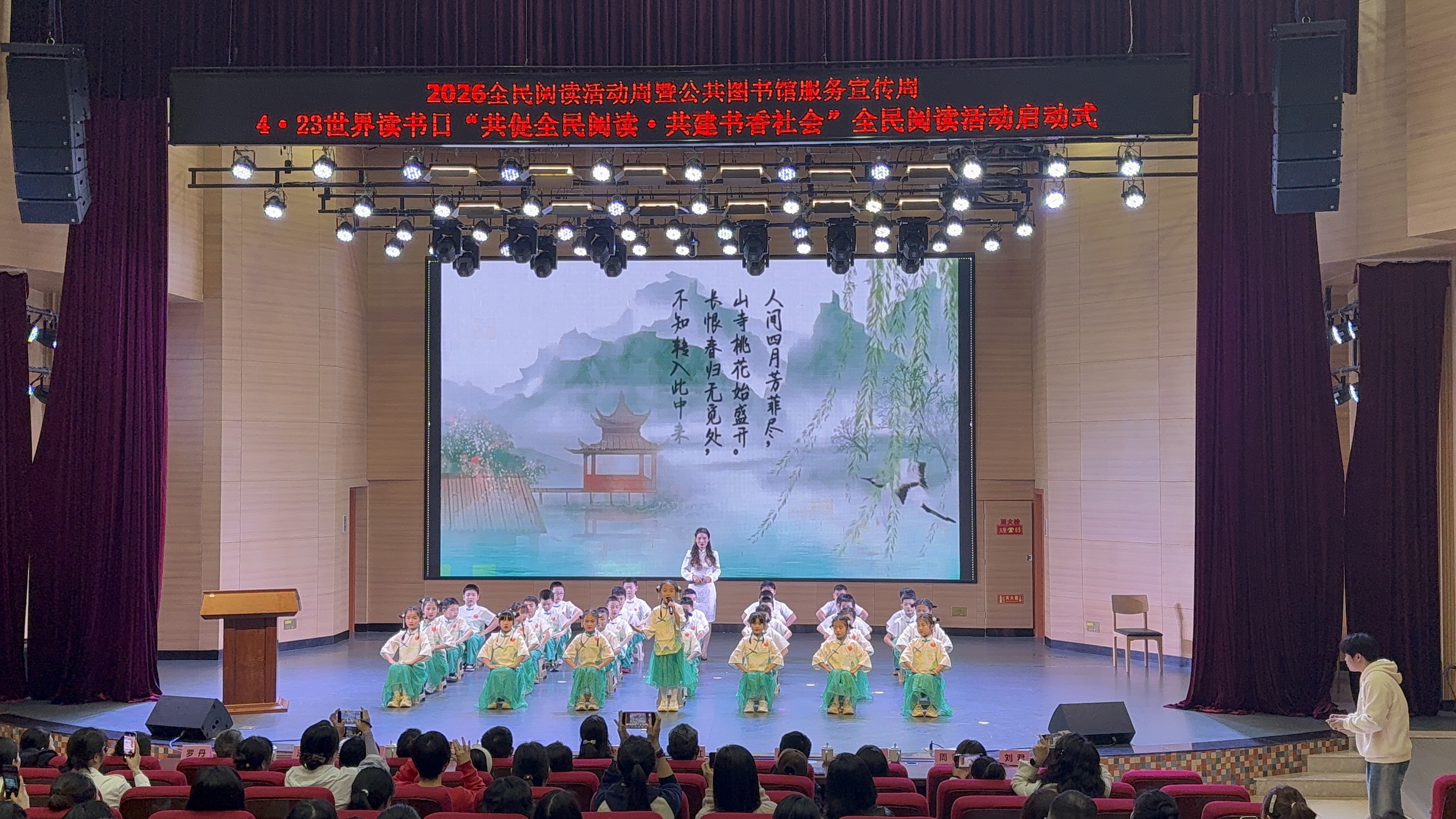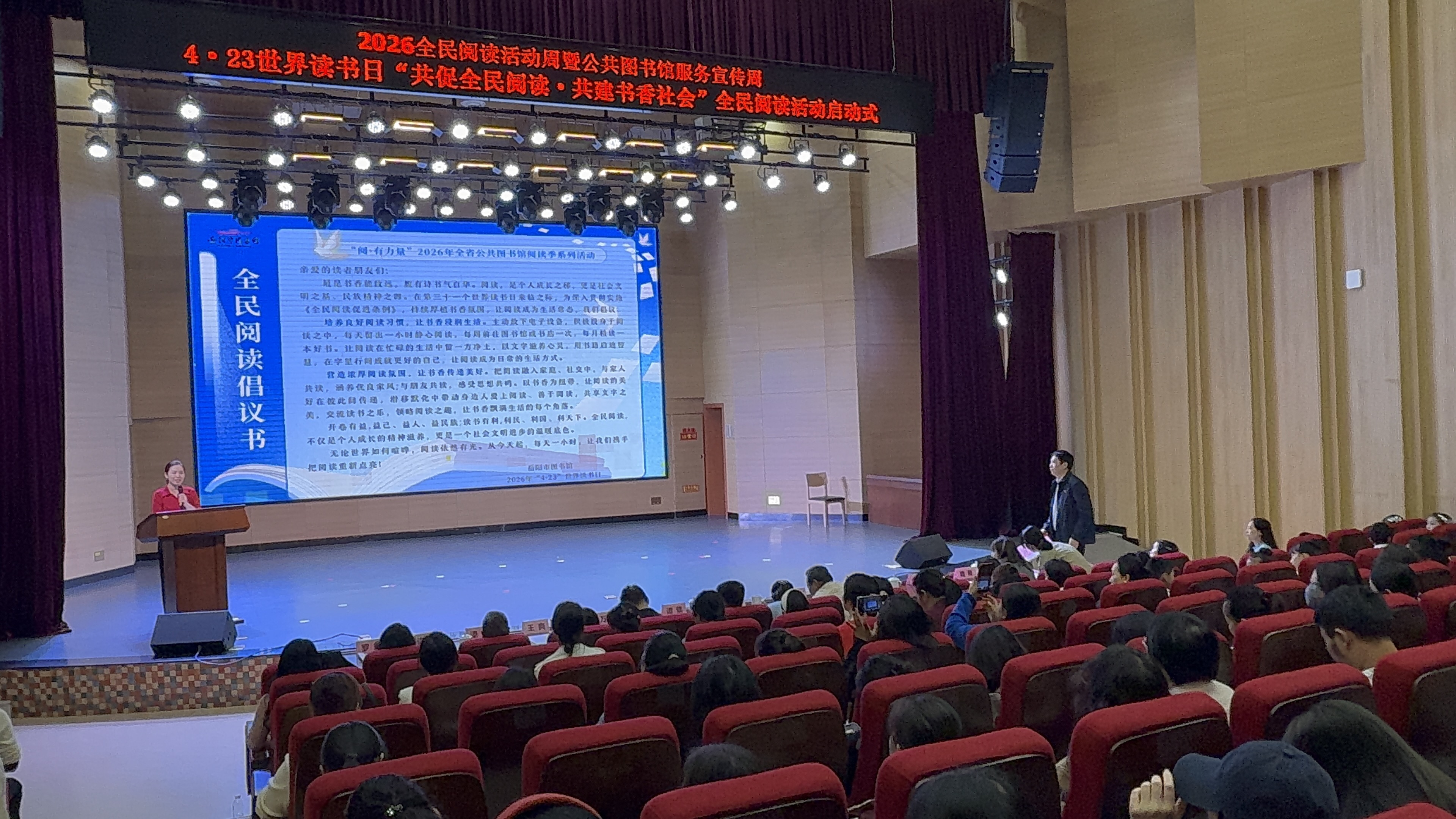人间四月书香浓,巴陵大地阅声朗。2026年4月23日,2026“世界读书日”岳阳市图书馆全民阅读启动仪式举行,同步开启“全民阅读活动周”暨公共图书馆服务宣传周,以实际行动落实我国首部《全民阅读促进条例》,持续擦亮“书香岳阳”文化名片。市文旅广电局、市妇联、市社科联等单位代表,师生、文化志愿者及读者代表齐聚现场。活动在暖场表演中拉开帷幕,全体人员宣读《世界读书日主旨宣言》,市文旅广电局领导致辞,充分肯定市图书馆在全民阅读推广、公共文化服务中的扎实成效,寄语以阅读厚植城市文化底蕴。