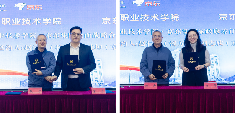仪式上,学校常务副校长赵仁康分别与京东集团代表张坤、刘志欣签署了《钟山职业技术学院·京东集团全面战略合作框架协议》和《钟山职业技术学院·京东集团家政康养订单班协议》。根据协议,双方将围绕共建产业学院、联合培养人才、协同促进就业、深化校园服务创新等方面开展全面合作,推动校企合作由点状对接向系统协同深化拓展。
