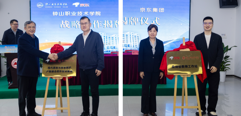 钟山职业技术学院蒋伏心校长、京东集团魏晓晖副总裁、钟山职业技术学院翟天灵书记、京东家政副总经理、全国培训负责人杨登辉先生共同揭牌“京东·钟山职业技术学院现代家政与养老照护产教融合校外实训基地”和“京东·钟山职业技术学院现代服务产业双师型教师工作站”揭牌。两个平台的落地,标志着双方合作进一步向课程共建、师资共育、基地共用、过程共管、成果共享的方向迈进,也为学校深化关键办学能力建设、提升技术技能人才培养质量提供了更加坚实的平台支撑。