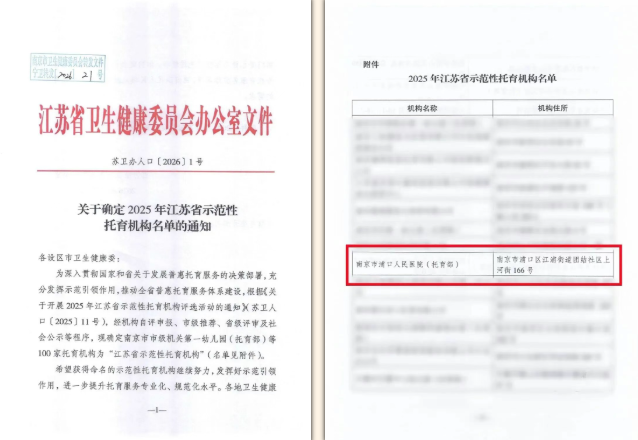 近日,江苏省卫生健康委员会发布2025年江苏省示范性托育机构名单,南京市浦口人民医院托育园凭借规范的办园管理、专业的“医育结合”服务以及扎实的惠民成效成功,获评“江苏省示范性托育机构”。