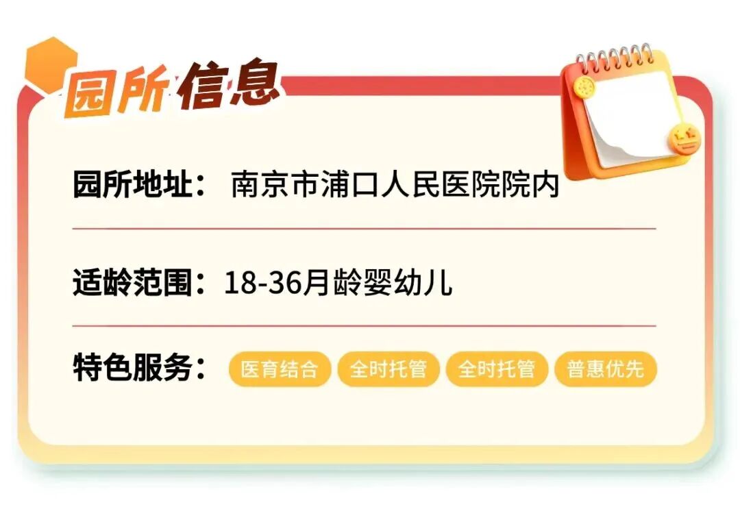 2024年4月:浦口区首家公立医院托育园建成,室内258㎡+户外600余㎡,2个混龄班、36个托位,配备“两教一保”标准团队。2024年8月:被南京市卫生健康委员会确定为“南京市普惠托育机构”。2024年12月:被江苏省卫生健康委员会确定为“江苏省普惠托育民生实事项目”。2025年3月:对原妇幼保健所一楼246㎡场地改造投用,室内总面积增至500㎡,新增运动活动室、午休室,托位扩充至55个。2026年3月:获评“江苏省示范性托育机构”。