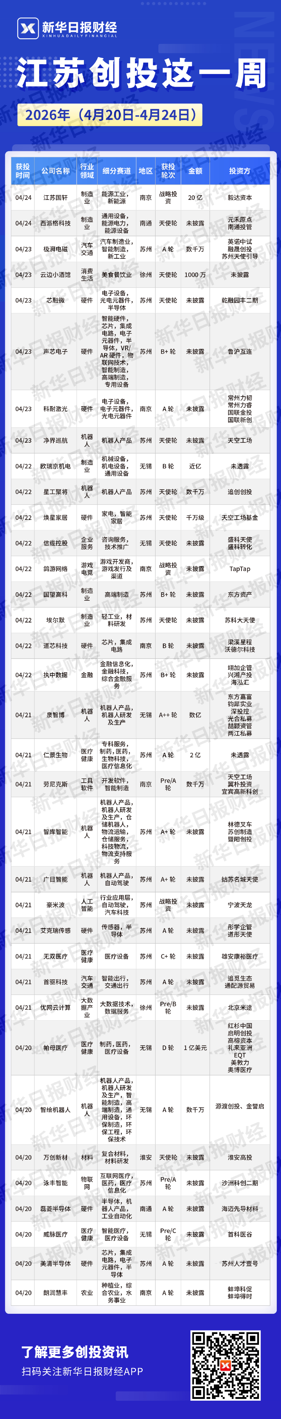 新华日报财经讯 本周(4月20日—4月24日),江苏共发生私募股权投融资事件35起,已披露的投融资总额超35.3亿元。具体来看,行业分布上,制造业4起、汽车交通1起、消费生活1起、硬件7起、机器人5起、企业服务1起、游戏电竞1起、金融1起、医疗健康4起、工具软件1起、人工智能1起、大数据产业1起、材料1起、物联网1起、农业1起;投融资轮次上,战略投资3起、天使轮9起、A轮9起、B+轮3起、B轮2起、A++轮1起、Pre-A轮2起、A+轮2起、C+轮1起、Pre-B轮1起、D轮1起、Pre-C轮1起;地域分布上,南京6起、南通2起、苏州18起、徐州2起、无锡6起、淮安1起。